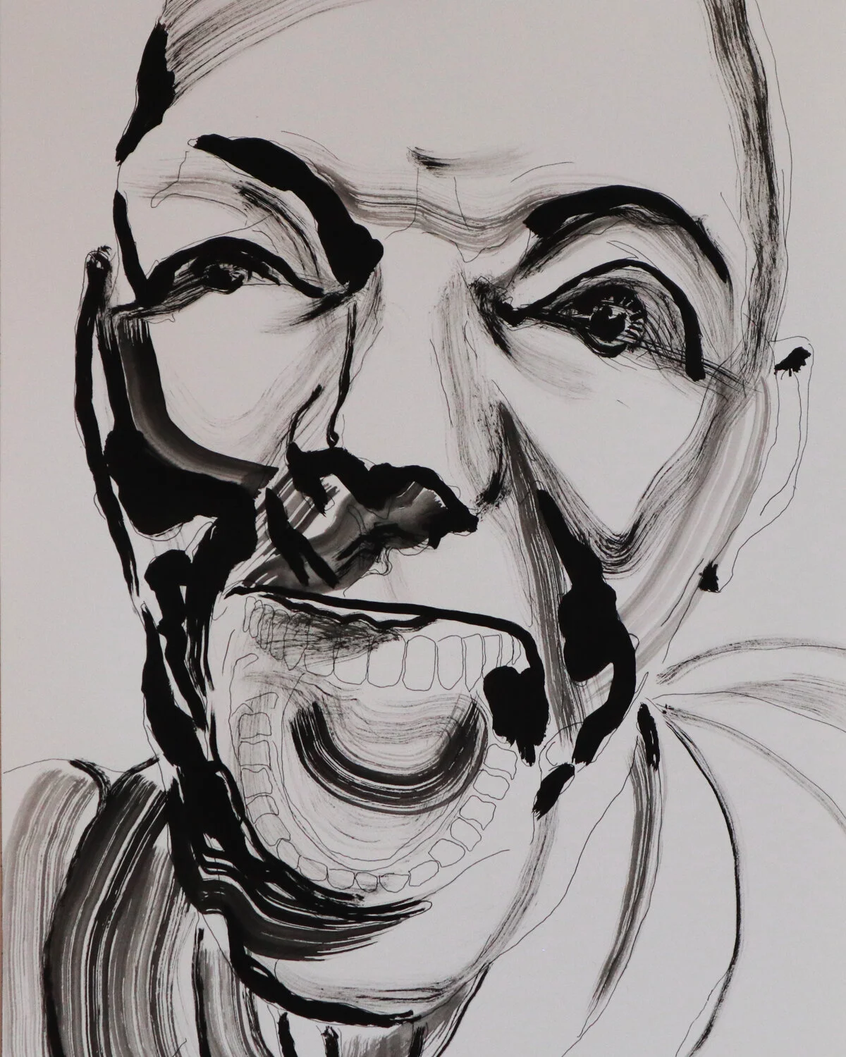 Ink paintings show faces and figures, some raw and some moving, exploring contrast and composition. They create a sense of energy, similar to brush strokes that suggest trees swaying in the wind. There is also a graceful use of traditional calligraphy and themes like bamboo or koi, which convey a sense of peace.