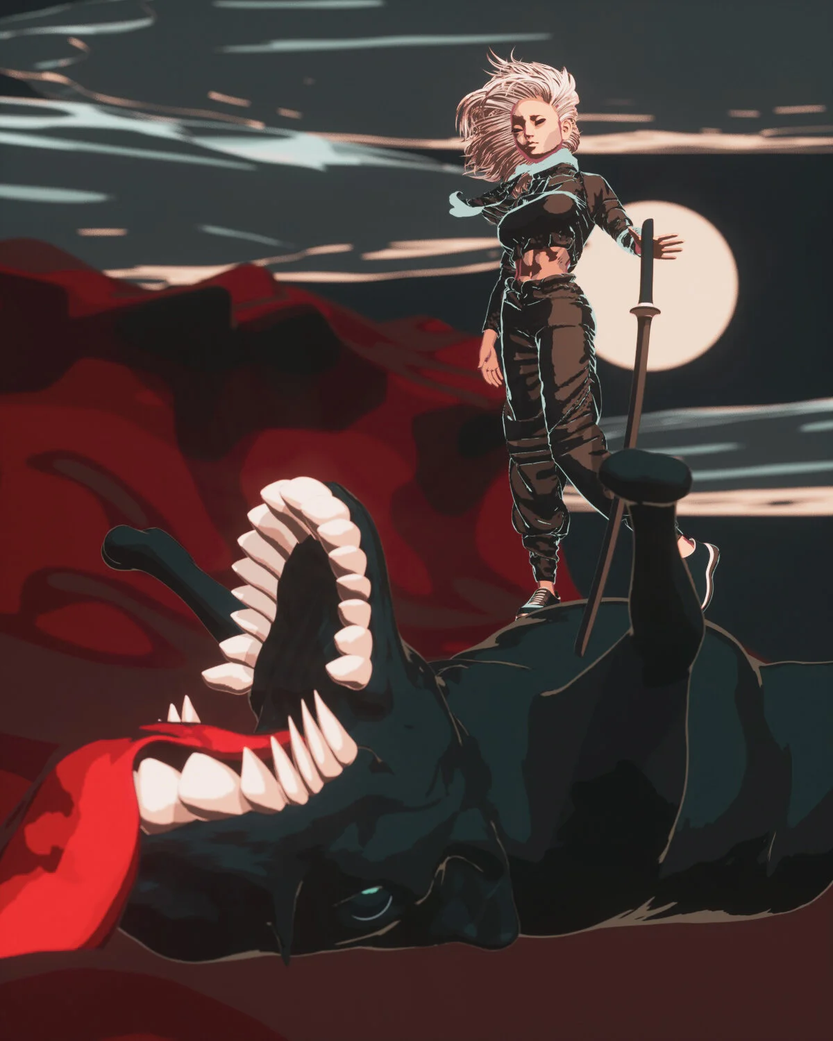 The rocky coast glowed with the last hues of sunset, waves crashing against the beast’s colossal carcass looming above the water. The heroine stood triumphantly on its belly, her silhouette bathed in the mysterious light. Her sword, still warm from battle, dangled loosely in her hand, its blade pointing steadily at the beast’s heart. God rays pierced the twilight, highlighting the contours of her strong, determined form. Her camouflage suit shimmered with subtle reflections of the fiery sky, blending seamlessly with the warm environment. As the sun dipped lower, the horizon blazed with orange and pink, casting long shadows that danced around her.